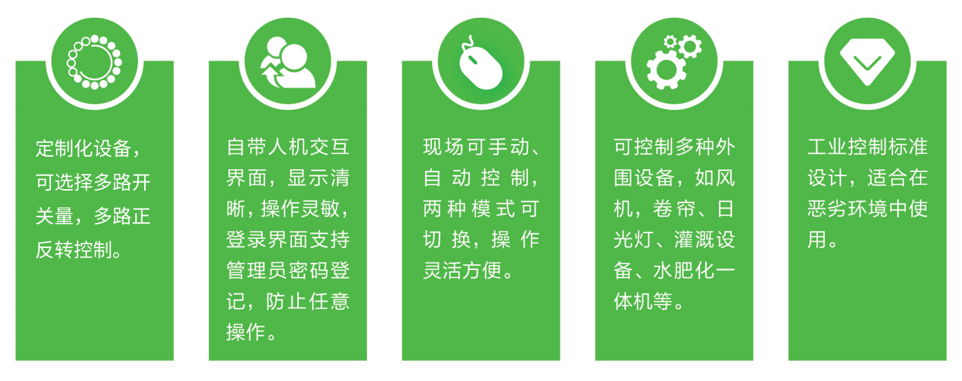 物联网智慧农业设备控制柜和温室内部的风机、水帘、遮阳电机、卷膜电机、卷被电机、加温电机、电磁阀门、水泵、水肥一体机等设备连接,根据传感器采集参数变化实时调控或自动控制温控系统、灌溉系统等,保持棚内适宜的生长环境,减少人工成本省时省力,提高生产效率。